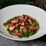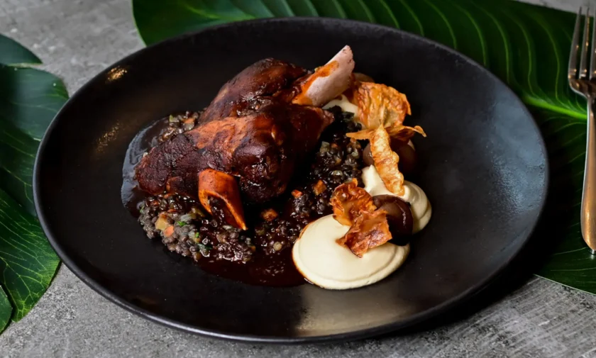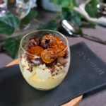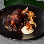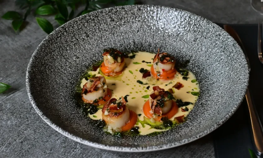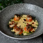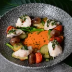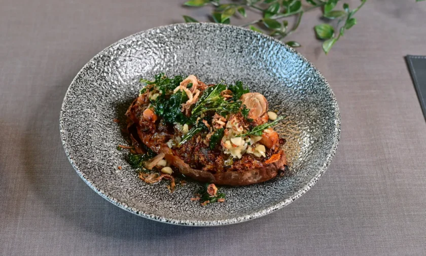 Kokosa–karija–citronzāles mērce, batātes biezenis, pancetta, kalē, mandeļu ‘vinaigrette‘ mērce – 2, 7, 14, 8, 9, 5, 6