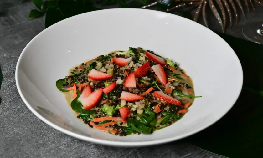 Ar ceptiem dārzeņiem, zaļumu salsu, grauzdētu kalē un krabju biska mērci -2, 4, 7, 9