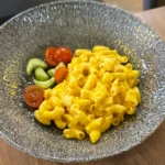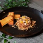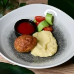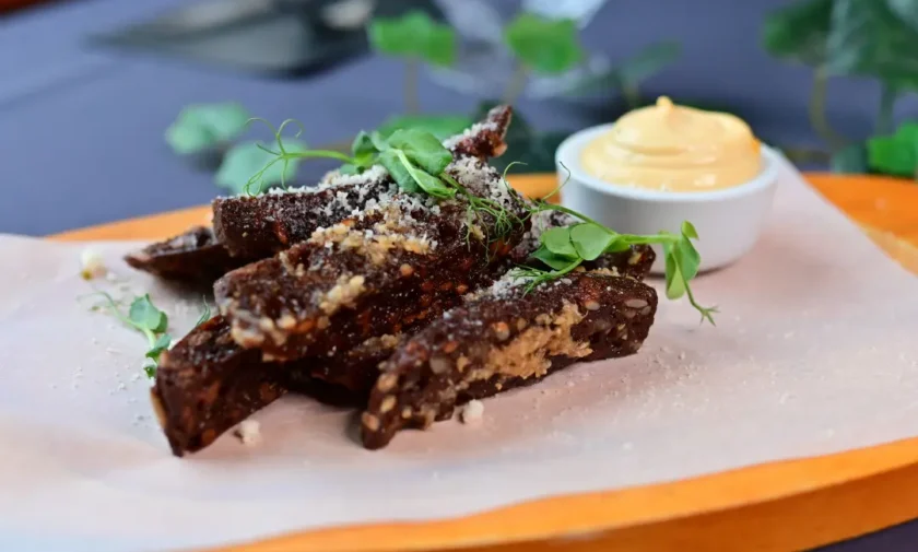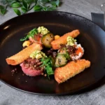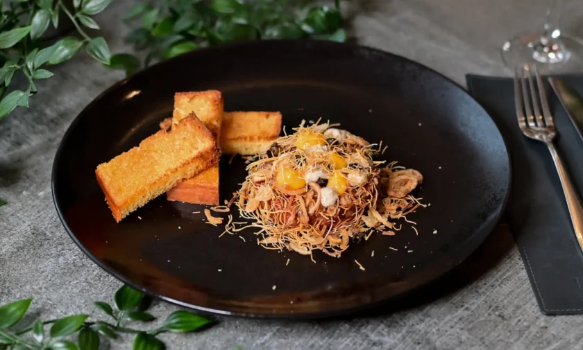 Dižonas sinepes, kataifi, brioša grauzdiņi, olu gels, cepti kaperi, sīpolu čipsi, trifeļu majonēze – 1,3,7, 10