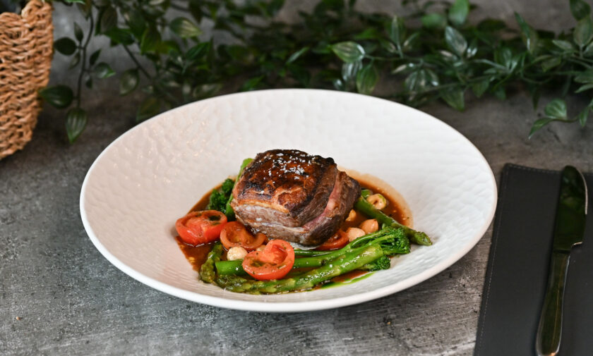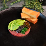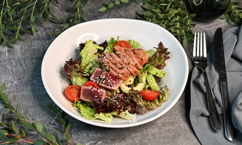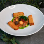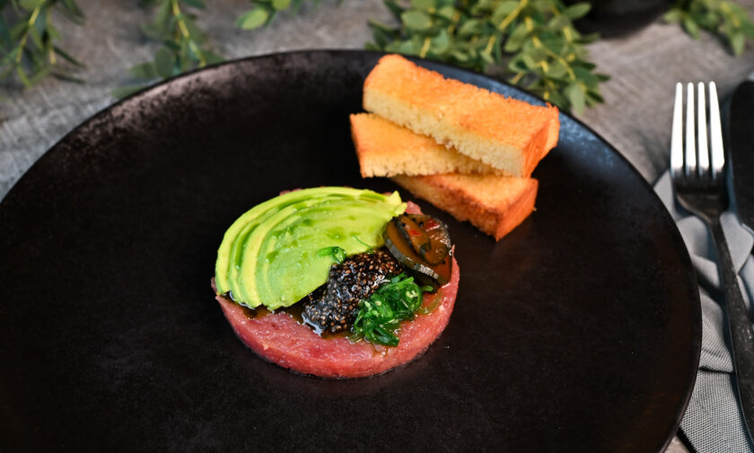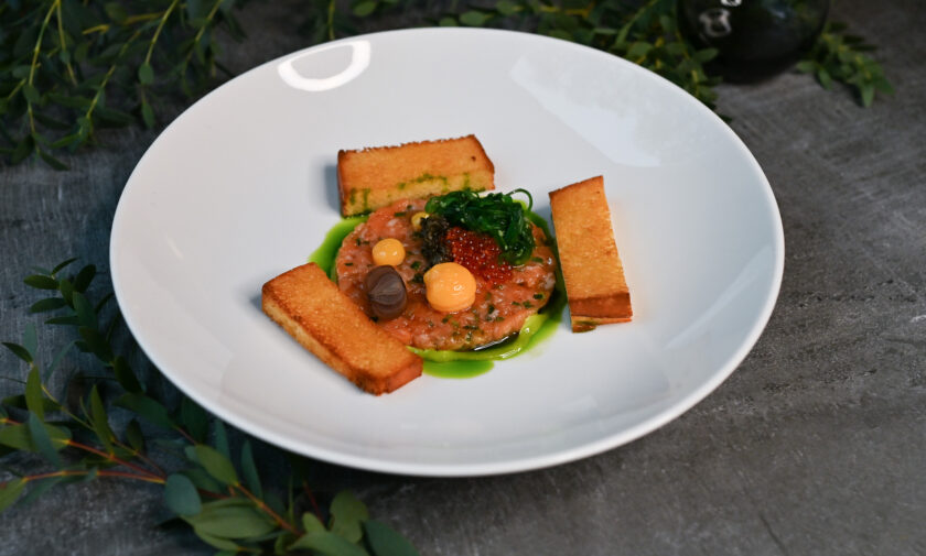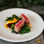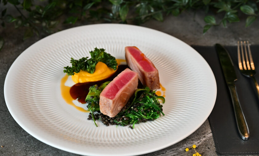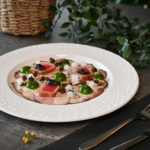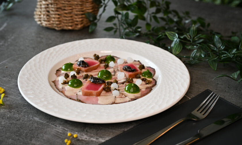 lēni gatavots teļa langets, liesmota tunča fileja, marinēti pērļu sīpoli, garšaugu aioli – 3, 4, 6, 7