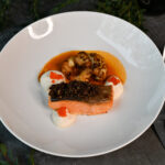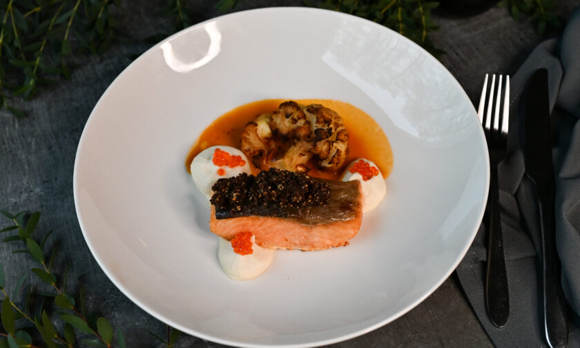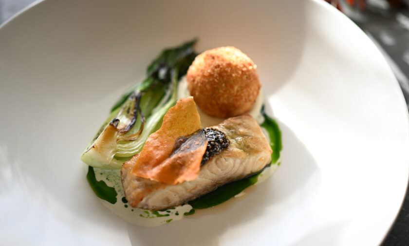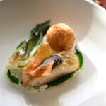 Sakņu seleriju krēms, kartupeļu-garšaugu krokete, pak čoi salāti, čia sēklu kaviārs, zivju-baltvīna mērce -1, 2, 3, 4, 6, 7, 9, 10, 11