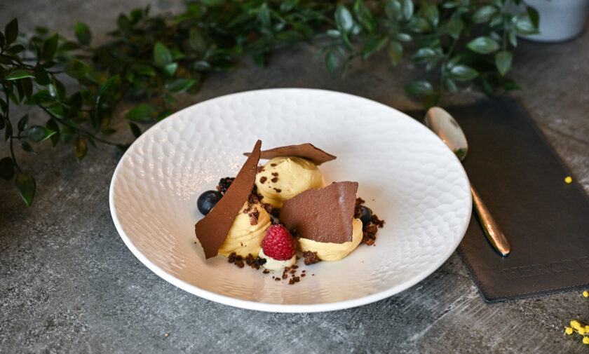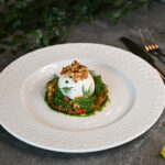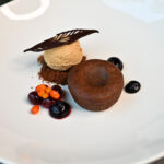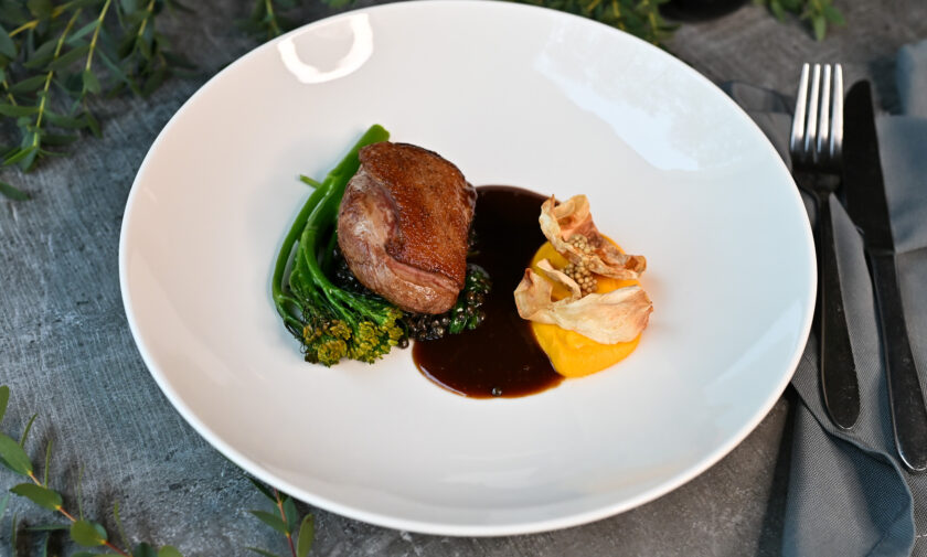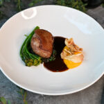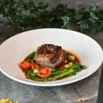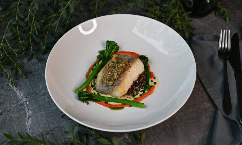 ceptu burkānu-kokospiena krēms, melnās lēcas, brokolini, selerijas saknes kraukšķi, graudu sinepes, sarkanvīna mērce – 7, 9, 10