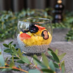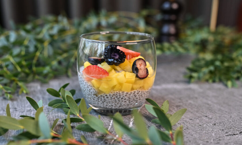 Čia-mandeļu pudiņš ar mango-vaniļas salsu