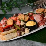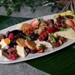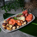 Grilētas tīģergarneles, mazsālīts lasis, prosciutto, chorizo, aitas siers ar melno ķiploku, trifeļu siers, Čedaras cepumi, olīvas, marinēti dārzeņi -1, 2,4, 7, 8