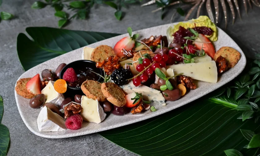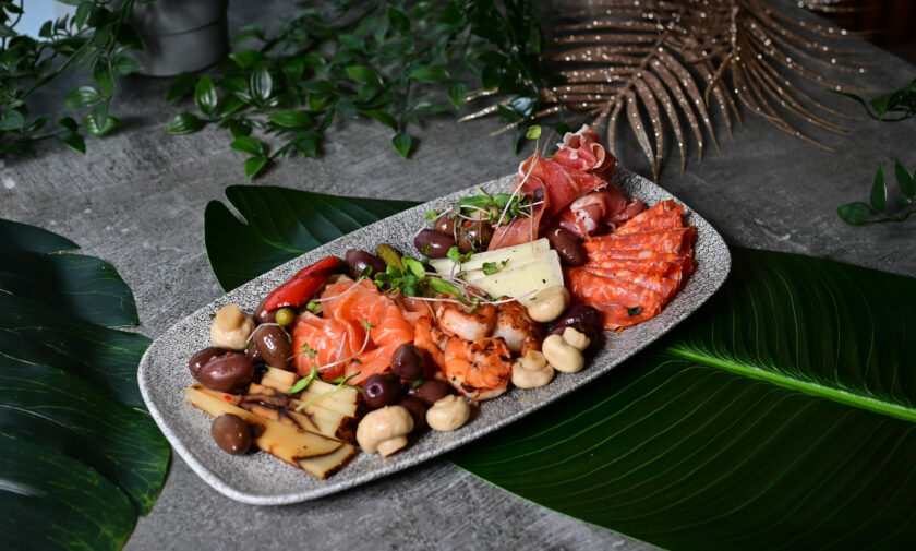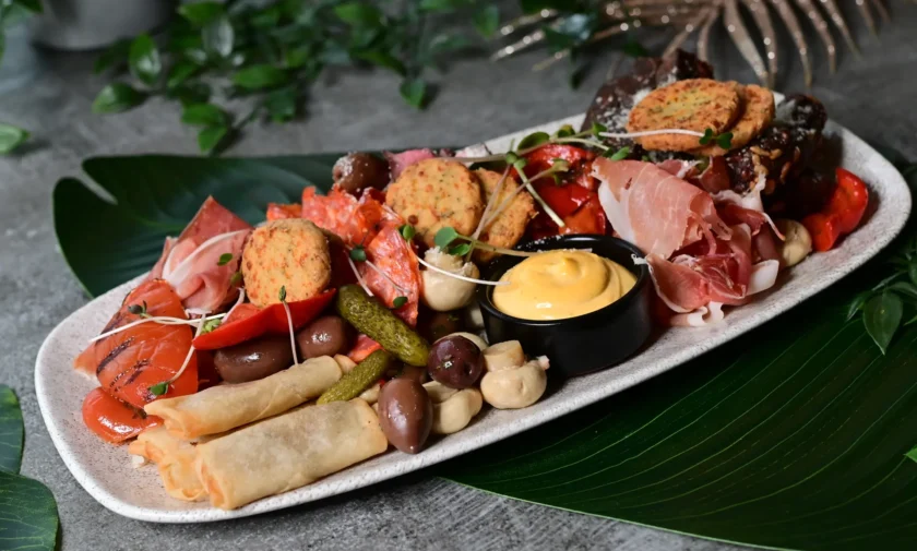 Ķiploku grauzdiņi, pavasara rullīši, chorizo, proschiuto, lēni gatavota teļa gaļ, marinēti dārzeņi, marinētas Kalamata olīvas, Čedaras siera cepumi 1,3,7, 8