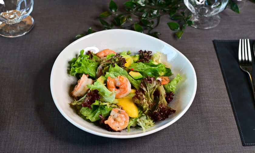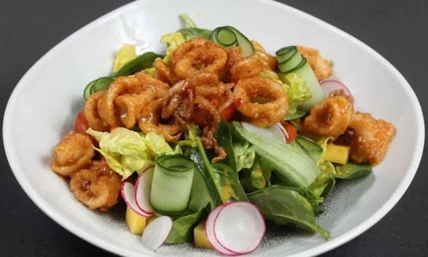 • Kraukšķīgie kalmāru salāti pikantā glazūrā ar lapu salātiem un “Nam Jim ” mērci