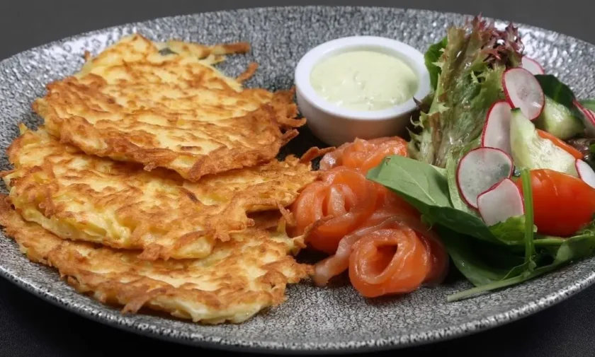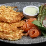• Kartupeļu pankūkas ar mazsālītu lasi un zaļumu krējumu