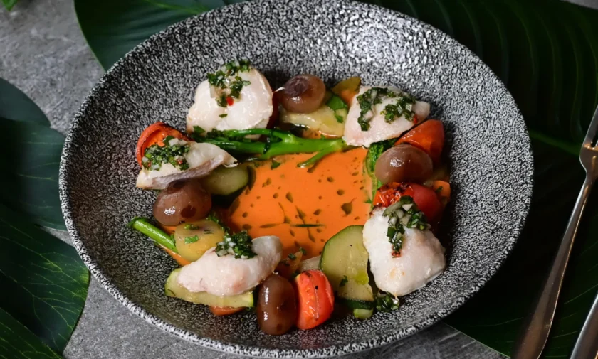 brokolini, ķiršu tomāti, cukīni, burkāni, selerijas saknes biezenis foreles ikri, zaļumu eļļa- 1, 2, 7, 4, 9
