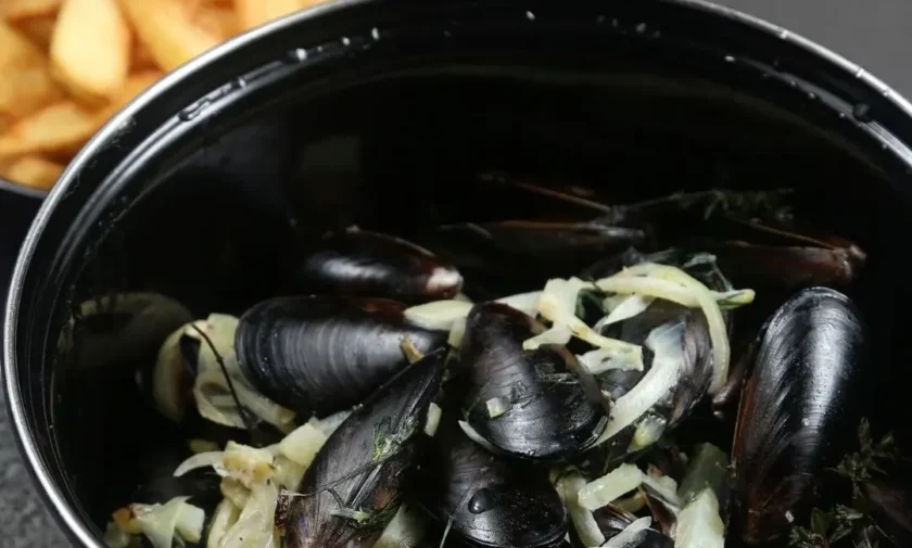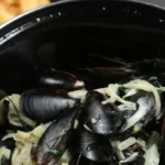 Mīdijas, baltvīns, saldais krējums, dārzeņi, zaļumi, grauzdēta ķiploku bagete- 1,7,9,14