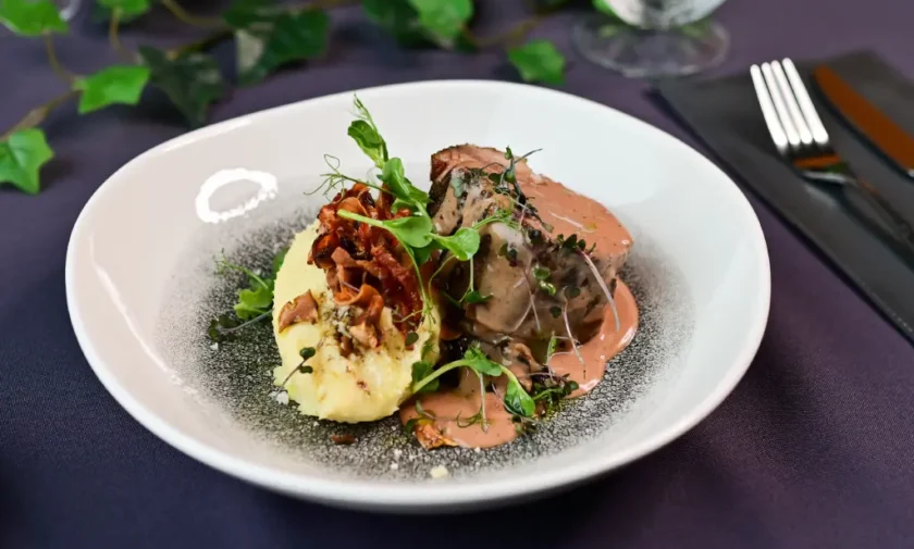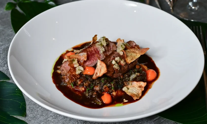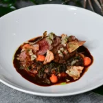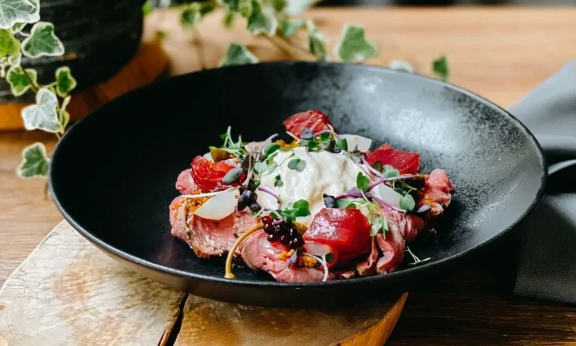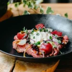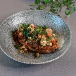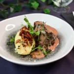 Lēni gatavota teļa langets, tunča aioli, kaperi, ķirštomāti, grauzdēti sīpoli – 3,4,6,10, 7, 1