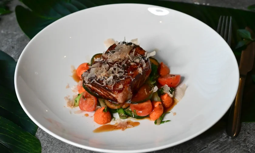 • Grilēts rozā tunča steiks sezama medus galazūrā ar ceptiem dārzeņiem