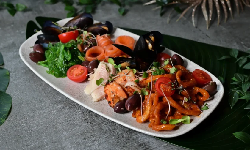 Kalmāri cepti čili sviesta glazūrā, mazsālīta laša fileja, kūpināta forele, tīģergarneles, mīdijas, marinētas jūras aļģes-1,2,3,4,6,7,9,11,14