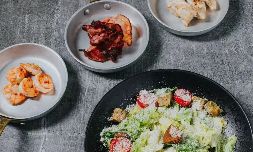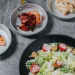 Salātlapas, parmezāna siers, maizes grauzdiņi, ķiršu tomāti, anšovu mērce – 1, 3, 2, 4, 7, 10