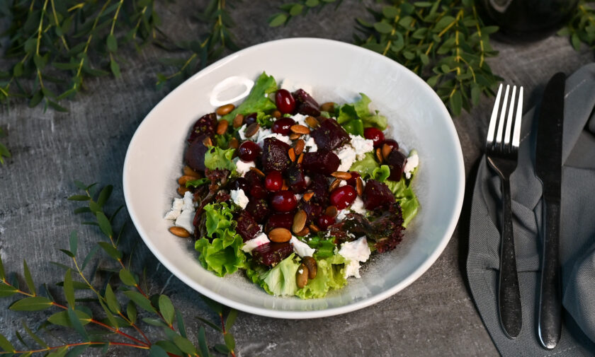 rozmarīna eļļā ceptas bietes, sālītas ķirbju sēklas, dzērvenes cukura glazūrā, bazilika pesto mērce -7, 8