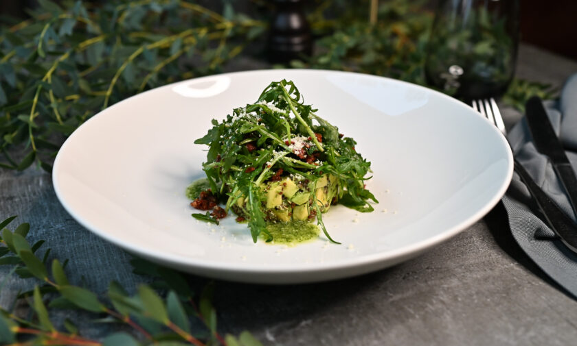 Rukola, kaltēti tomāti, parmezāna siers, diļļu pesto mērce – 7, 8