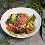 Lapu salāti, gurķi, tomāti, avokādo, citrusu-terijaki mērce – 4, 11, 6