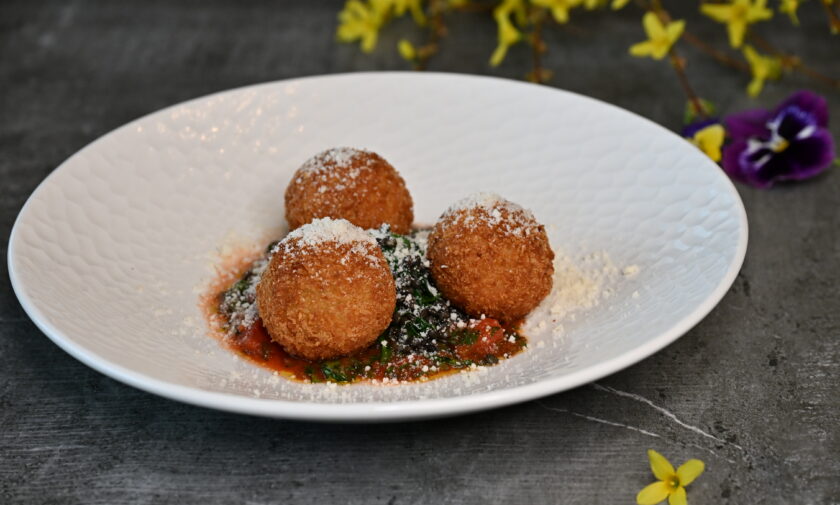 Vistas krūtiņa ar kartupeļu-trifeļu biezeni, ceptiem dārzeņiem un parmezāna buljona mērci