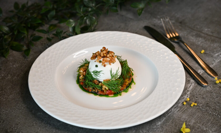 Jūras zāle, marinēti pērļu sīpoli, olu gels, cepti kaperi, foreles ikri, brioša grauzdiņi – 1, 3, 4, 6, 11