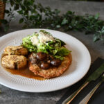 kartupeļu konfits, lapu salāti, pētersīļu aioli, ceptas sēnes, glazēti sīpoli, burbona-saldā krējuma mērce -1,3,7