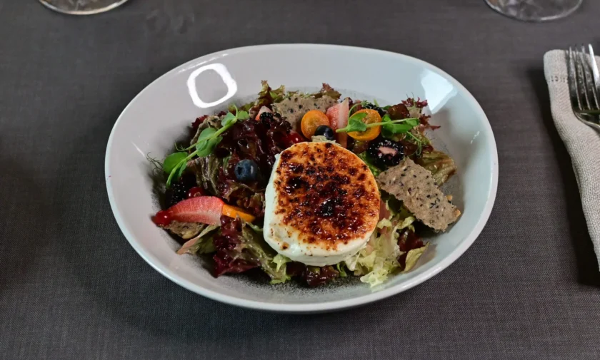 Karamelizēts kazas siers ar lapu salātiem un svaigām ogām