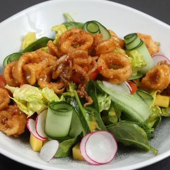 Kraukšķīgie kalmāru salāti pikantā glazūrā ar lapu salātiem un “Nam Jim ” mērci