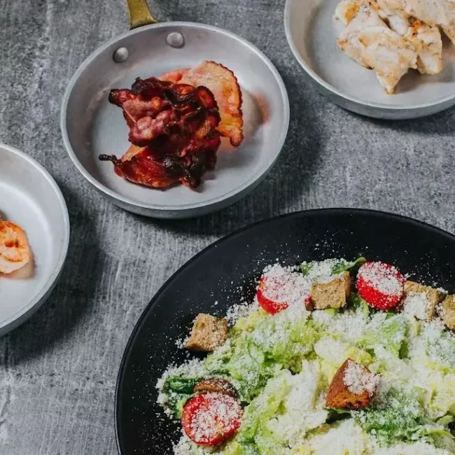 Salātlapas, parmezāna siers, maizes grauzdiņi, ķiršu tomāti, anšovu mērce – 1, 3, 2, 4, 7, 10
