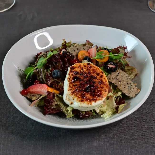 Karamelizēts kazas siers ar lapu salātiem un svaigām ogām