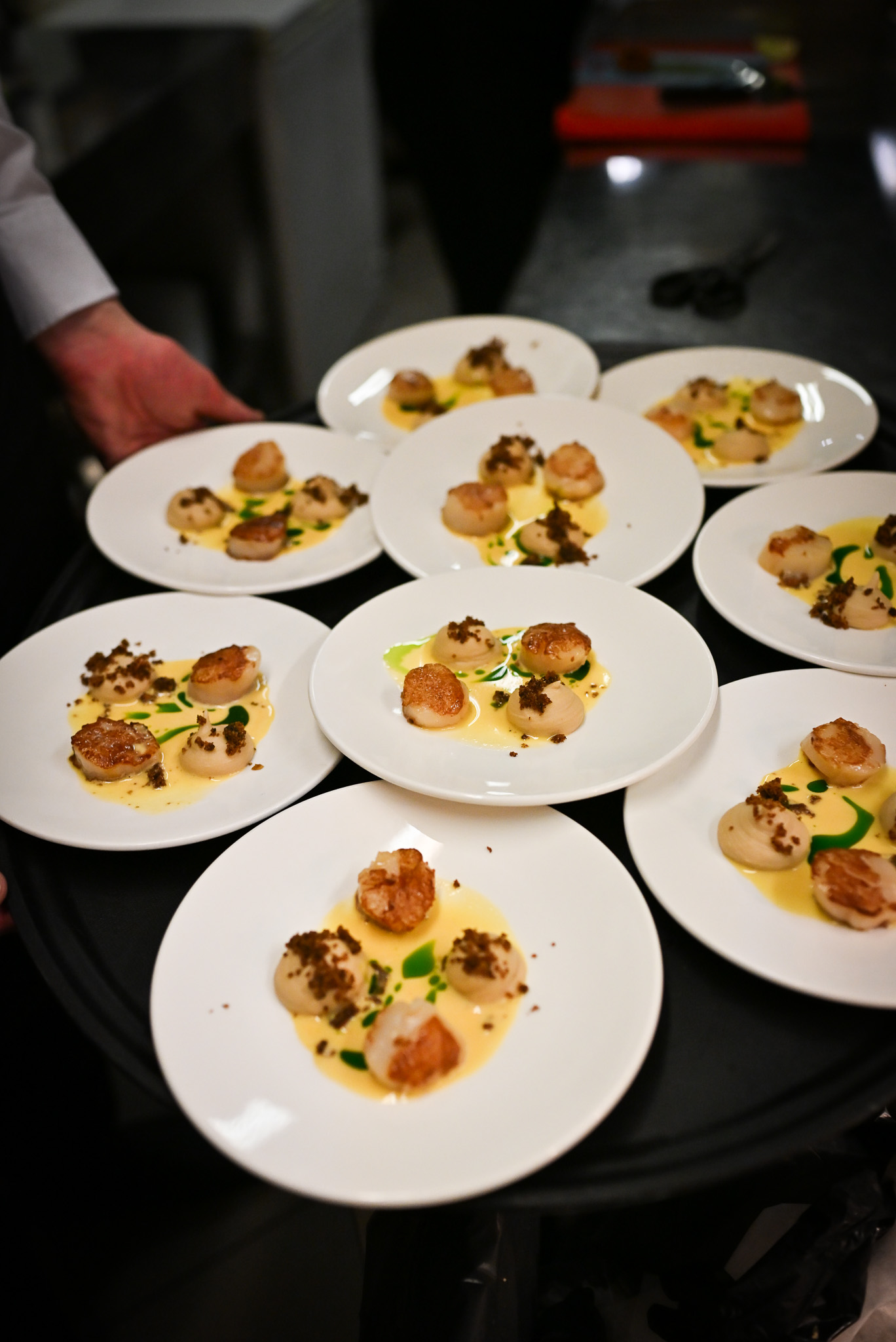 sakņu seleriju konfits, šalotes sīpolu-sviesta pudiņš, austersēnes, zaļo pipargraudu mērce